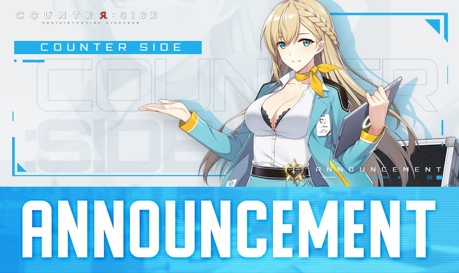 Dear CEOs, As announced before in the CounterSide Showcase NEW ORIGIN, Danger Close will only have a single boss after the update. As such, the value of duplicate operators has dropped significantly. To compensate for the issue, we are going to accept applications for CEOs to apply for completely different operators to the same value, in the main skill level and the Side Skill level. Now, this will only apply to CEOs who have raised operators to the same operator in the main skill level and the Side Skill level. (For example, having two Kim Hanas with the same operator main and Side Skill levels) Therefore, if the CEOs have the same operators, but different skills and/or levels, then the exchange won’t apply. We are sorry for the inconvenience because we could not think about this possibility. More detailed information on the operator exchange is as below. ◈ Application Period February 10, 2023 – February 28, 2023, 00:00 UTC+9 March 17, 2023, 00:00 UTC+9 (Extended) * The application period may change and we will notify you if it does. ◈ Requirement – Has the duplicate operators with the sum of their Side Skill equal to or more than 15. * The duplicate operators must be SSR rarity. (added) ◈ Exchange Method – Will recollect one of the operators and send an operator of the same “level specification” as the one that was recollected. ※ CEOs can also exchange for operators who have a different Side Skill. ※ You can select any operator from the two to exchange for the new one. (ex. if you have applied for level 11 and level 5 Kim Hana, you can select any of the two) ◈ List of Exchangeable Operators: – Lee Sooyeon – Anastasia Chernova – Lena Mackenzie – Replacer King – Moneca – Serina Crew – Rachel Dodds – Mansion Master – Momo – Chloe Starseeker – Operator Sigma – Kim Hana – Other operators that may be featured during the application period ◈ How to Apply – Official Website’s 1:1 Inquiry [LINK] ◈ Required Attachments – A screenshot of your [ Settings > Account ] Page – A screenshot of your operator management screen of who you are going to apply for the exchange. – The type of operator that you want to exchange with detailed information (example: Operator Sigma, Level 75, Command level 2, Attack Speed level 11) – The operator information that you are exchanging for. (example: Kim Hana, Level 75, Command level 2, Attack Speed level 11) ◈ Number of possible Exchange – 2 times per person (based on your Business Registration Number) ◈ Actual Compensation Period ▷ After February 22nd, 2023 ~ Until Completion ※ During the compensation operation, the CEOs may be temporarily restricted to access the game. ◈ Notes – If the information and the actual state of the operators differ, then the exchange may not be possible, Therefore, after the application, do not level or change anything for the applicable operators. – The operators will be sent out on a first-come first serve basis. – To make sure the operation runs smoothly, the CEOs may be temporarily restricted from accessing the game. – The level progression will not transfer. (Example level 75, 70% progression → level 75, 0% progression to 76.) – Once the operator is exchanged as compensation, then the exchanged operator does not apply to exchange for the second time. – If the submitted document is incomplete, then the compensation will not be sent.