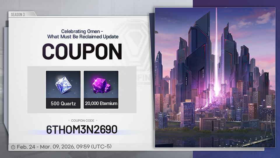 Dear CEOs,With the new Omen substream, What Must Be Reclaimed Update,A special coupon code is prepared for our CEOs!Code: 6THOM3N2690▼ Coupon Content▷ 500 Quartz▷ 20,000 Eternium▼ Available Schedule▷ Valid Thru: March 9, 2026 09:59 (UTC-5)NoteCEOs can receive the coupon code only once.The coupon gift will be deleted when the valid period expires. Therefore, please receive it within the period.An expired countdown coupon gift cannot be restored by any means.