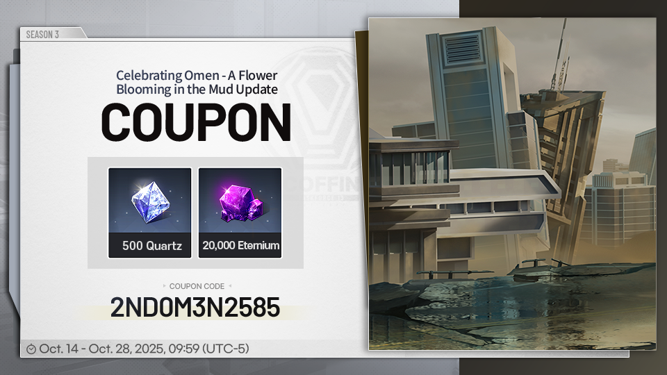 Dear CEOs,With the new Omen 2, A Flower Blooming in the Mud Update,A special coupon code is prepared for our CEOs!Code: 2ND0M3N2585▼ Coupon Content▷ 500 Quartz▷ 20,000 Eternium▼ Available Schedule▷ Valid Thru: October 28, 2025 09:59 (UTC-5)NoteCEOs can receive the coupon code only once.The coupon gift will be deleted when the valid period expires. Therefore, please receive it within the period.An expired countdown coupon gift cannot be restored by any means.