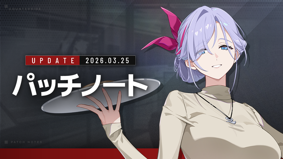 日頃より『カウンターサイド』をご愛顧いただき、誠にありがとうございます。3/25 (水)アップデートの内容をご案内いたしますので、詳細は下記にてご確認ください。◈ メンテナンス内容▣ 実施時間: 3/25 (水) 10:00 ~ 12:00▣メンテナンス中はゲームに接続することができませんので、ご注意ください。▣メンテナンス報酬: クレジット x 20,000、採用契約書 x 3▣ 注意事項– アップデート中、メンテナンス内容は、追加/変更となる場合がございます。– メンテナンス状況によって日程が変更となる場合がございます。– メンテナンス報酬は、2026.03.27 (金) 23:59までログインするとメールボックスから受け取れます。※ メリー・クルーの日本語ボイスが追加される場合、アップデートのお知らせなどで改めてご案内いたします。◈ ショップ今週のショップアップデートの詳細内容は、下記の商品入荷のお知らせでご確認いただけます。[商品入荷のお知らせ]1. 新規オペレーター1) 新規オペレーター「メリー・クルー」が追加されます。2) [ショップ] > [交換所] > [プラネットモール]に「メリー・クルー」の即時採用が追加されます。◈ メリー・クルー*不屈の心:4回ダメージを受けると解除される鉄壁状態を付与、鉄壁状態が維持される間、特殊スキル以下の硬直に免疫*慈愛の心:有効打撃吸収 +200%、究極スキル以下の硬直免疫を付与「イラスト」◈ 「メリー・クルー」採用確率UP◆ 開催期間- 2026.03.25 (水) メンテナンス終了後 ~ 2026.04.08 10:00 2. ガントレット▣ ランク戦1) 「2026ロイヤルシーズン」が終了します。▷ 終了日時:2026.03.29 (日) 22:00▷ 決算期間:2026.03.29 (日) 22:00 ~ 2026.03.30 (月) 04:00※ 「2026ロイヤルシーズン」スキン報酬は「逮捕します、ヒューマン」です。※ 既にスキン報酬を保有している場合は代わりに「フレーム:逮捕完了」を獲得できます。2) 「2026デボーションシーズン」が始まります。※ 新規ガントレットスキンは2026.04.01 (水) 定期メンテナンスを通じて追加される予定です。◆ 開催期間- 2026.03.30 (月) 04:00 ~ 2026.06.28 (日) 22:003) ランク戦のBANルールが変更されます。- 第1週はBAN対象ユニットが選定されません。- 第2週以降は、毎週3名ずつBAN対象ユニットが選ばれます。- BAN対象に選ばれたユニットは、シーズン終了まで編成できません。- BAN対象は、最多勝利社員2名と、キャスティングBAN投票で1位の社員1名が選ばれます。- 最多勝利社員とキャスティングBAN社員1位が同一の場合は、キャスティングBAN投票2位の社員が代替されます。- 艦船のBANルールは変更されません。3. レイド - 「クラーケン」シーズン1) レイドボス「クラーケン」がシーズン期間中に登場します。◆ シーズン期間:- 2026.03.25 (水) メンテナンス終了後 ~ 2026.04.08 (水) 10:00※ 「クラーケン」 シーズンローテーションと功労トロフィー交換所の報酬が更新されます。※ 今シーズンに出現したレイドボスのみ、レイドポイントが支給されます。(前シーズンに出現したレイドボスを退治した場合は、退治報酬のみの支給となります)※ レイドボス「クラーケン」に根源性「安定」が付与されます。4. 専用装備チャレンジ – グレモリーのお悩み相談1) グレモリーのバーの専用装備を製作するためのチャレンジが開催されます。◆ 開催期間:- 2026.03.25 (水) メンテナンス終了後 ~ 2026.04.01 (水) 10:00◆ ダンジョン構成- ACT.1~2ステージで構成されています。- ステージは2つのステージで1つの区間を成し、それぞれ異なる戦闘コンセプトを持っています。- チャレンジモードでは「グレモリーのバー」専用のバフが追加され、配置した「グレモリーのバー」ユニットのステータスが増加します。◆ 報酬案内- チャレンジモードをクリアして、「グレモリーのバー」カスタム金型制作に使用される素材「欲望の実り」を獲得しましょう!※ チャレンジに勝利した場合のみ獲得可能です。- チャレンジモードステージをクリアすると、[初回クリア報酬]と[メダル完遂報酬(3メダル達成報酬)]を獲得でき、チャレンジ反復報酬として[欲望の実り]を獲得できます。- チャレンジモード勝利時に獲得する[欲望の実り]アイテムを通じて、「グレモリーのバー」金型を制作できます。※ チャレンジステージ報酬- 初回クリア報酬:欲望の実り- メダル完遂報酬:クォーツ- 反復報酬(ステージドロップ):欲望の実り◆ 専用装備- [工房] > [製作施設] > [専用装備]タブから制作可能です。- 「グレモリーのバー」の専用装備制作金型アイコンをクリックするとリストを確認できます。- 「グレモリーのバー」カスタム金型制作には[高級装備素材]、[クレジット]、[欲望の実り]が必要です。- 制作方法は既存の金型と同様で、即時制作できます。- 制作可能な専用装備リストは以下の通りです。- チャレンジステージをクリアすると、低確率でグレモリーのバー専用装備の完成品を獲得できます。- 「グレモリーのバー」専用装備を解体すると、「欲望の実り」50個を獲得できます。※ 金型製作やクリア時に獲得できる専用