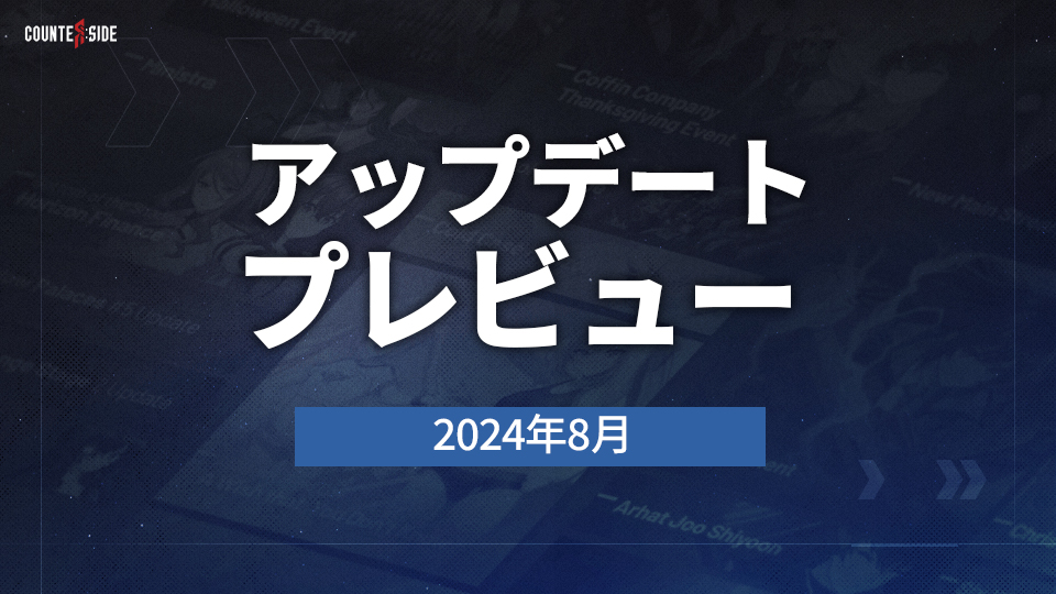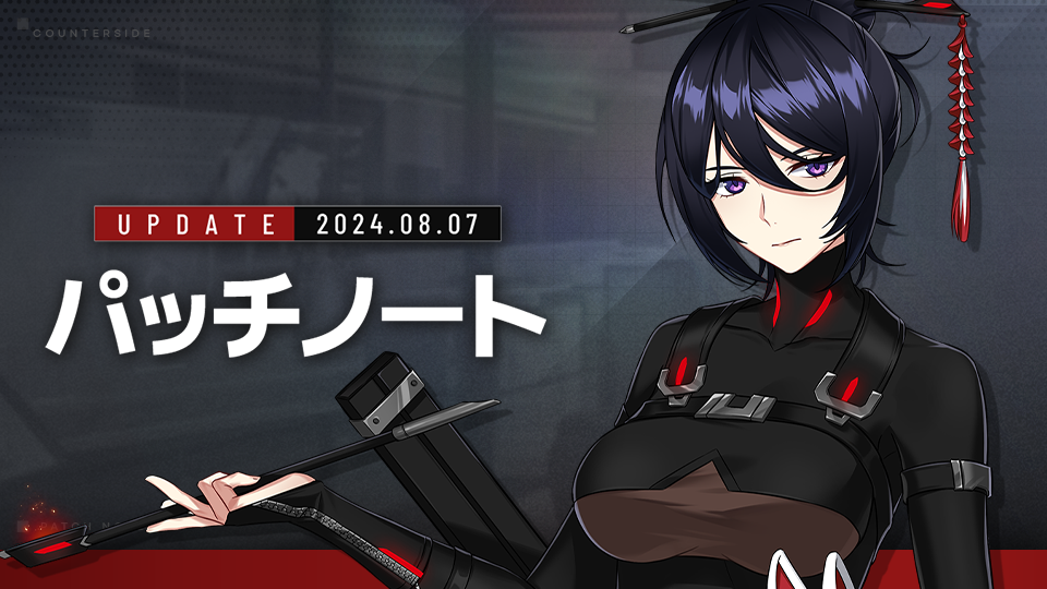 日頃より『カウンターサイド』をご愛顧いただき、誠にありがとうございます。 8/7(水)アップデートの内容をご案内いたしますので、詳細は下記にてご確認ください。◈ メンテナンス内容▣ 実施時間: 8/7 (水) 14:00 ~ 16:00▣メンテナンス中はゲームに接続することができませんので、ご注意ください。▣メンテナンス報酬: クレジット x 20,000、採用契約書 x 3▣ 注意事項– アップデート中、メンテナンス内容は、追加/変更となる場合がございます。– メンテナンス状況によって日程が変更となる場合がございます。※ 速水早苗 - 火仙剣の日本語ボイスが追加される場合、アップデートのお知らせなどで改めてご案内いたします。◈ ショップ今週のショップアップデートの詳細内容は、下記の商品入荷のお知らせでご確認いただけます。[商品入荷のお知らせ]▣ 機密採用登場!【イヴ・マイトナー:ガアグシェブラ】 ▼ イヴ・マイトナー:ガアグシェブラの採用期間 :▷ 2024.08.07 (水) メンテナンス終了後 ~ 2024.08.28 14:00▣ 一般採用確率UP!1) カスタムピックアップ採用が開催されます。- SSRカスタムピックアップではSSR社員を確定採用対象として選択し、採用することができます。- 採用期間:2024.08.07 (水) メインテナンス終了後 ~ 2024.08.28 14:00 - 確定採用回数: 150回- 確定採用回数の内1体は確定採用社員が必ず登場します。- 確定採用社員を獲得すると確定採用回数がリセットされます。- 確定採用社員を獲得しても獲得対象社員は変更されません。- 確定採用対象の選択は最大3回までできます。- 確定採用回数が残っている状態で確定採用対象を変更する場合、残っている確定採用回数はリセットされます。- 採用期間が終了すると残っている確定採用回数はリセットされます。- SSRカスタムピックアップで選択できる社員のリストは通年採用のSSR社員リストと同じです。▣ カウンターパス 新規カウンターパスが追加されます。スペシャルプランを購入すると新規社員「速水早苗 - 火仙剣」を獲得できます。 ▣ 通年採用通年採用のリストに以下の社員が追加されます。▷ ジュディ・スウィフト▣ アーケード1) ガントレット:アーケード「ガントレットシュミレーター」が開催されます。 ◆ 開催期間- 2024.08.07 (水) メンテナンス終了後 ~ 2024.08.13 23:59◆ 戦闘環境- 残り時間1分30秒から回復弱化 60%- 残り時間1分から回復弱化 80%◆ ルール- BAN&UP適用- 装備能力値未適用- 最大8体の社員を編成できます。◆ 報酬- アーケードランダムボックス x 1 (毎日アーケード3回勝利)▣ ランク戦1) ランク戦のローテーションBAN対象の選定において、ゴールドリーグ以下の結果は反映されないように変更されます。▣ 激戦支援 1) 激戦支援 - 根源シーズン:ナイト再生体が開催されます。▷ 殲滅期間 : 2024.08.07 (水) メンテナンス終了後 ~ 2024.08.14 (水) 04:00▷ 決算期間 : 2024.08.14 (水) 04:00 ~ 2024.08.21 (水) 04:00◆ 戦闘環境- EASY: [空中]ユニットの移動速度25%減少、[地上]ユニットの攻撃力30%、移動速度10%増加- NORMAL: [空中]ユニットの移動速度50%減少、[地上]ユニットの攻撃力30%、移動速度10%増加- HARD&EXPERT : [空中]ユニットの移動速度75%減少、[地上]ユニットの攻撃力30%、移動速度10%増加※ EXPERT難易度には根源性「変化」が適用されます。2) EXPERT難易度の殲滅点数と時間点数が調整されます。■ 殲滅点数変更前:15,000点変更後:20,000点■ 時間点数変更前:最大7,000点変更後:最大8,000点▣ イベント1) サブストリームエピソード「リトル、ヴィンセント」の通貨ドロップボーナスイベントが開催されます。▼ 開催期間:▷ 2024.08.07 (水) メンテナンス終了後 ~ 2024.08.14 14:00▣ 出勤チェック◈ 前夜祭カウントダウン! 前夜祭カウントダウン!が2024.08.07 (水) メンテナンス終了後から開催されます。▼ 開催期間:▷ 2024.08.07 (水) メンテナンス終了後 ~ 2024.08.14 14:00▣ イベントチャレンジ - 救世の夜 救世騎士団の専用装備を製作するためのチャレンジが2024.08.07 (水) メンテナンス終了後から開催されます。専用装備チャレンジ「救世の夜」をクリアすると、救世騎士団専用装備の制作材料「救世騎士団の勲章」と一定の確率で救世騎士団専用装備を獲得できます。[救世騎士団の勲章] ▼ 専用装備製作専用装備製作のためには以下の材料が消費されます。▷ クレジット x 2,500,000▷ 救世騎士団の勲章 x 400▷ 高級装備素材 x 600▼ 製作可能な専用装備リスト ▼ 開催期間 ▷ 2024.08.07 (水) メンテナンス終了後 ~ 2024.08.14 (水) 14:00▣ 改善および変更事項1) 協力会社を申請する際に、相手の届いた申請が上限に達している場合に表示されるメッセージが変更されます。今回のアップデート内容のお知らせは以上となります。今後とも「カウンターサイド」をよろしくお願いいたします。