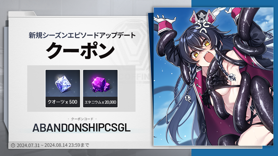 日頃より『カウンターサイド』をご愛顧いただき、誠にありがとうございます。 期間限定クーポンをご案内いたしますので、詳細は下記にてご確認ください。▼ クーポンコード:ABANDONSHIPCSGL ▼獲得アイテム:▷ エタニウム x 20,000▷ クオーツ x 500▼ 有効期限:2024.08.14 23:59まで▼ クーポンの使い方▷ ゲーム設定>アカウント管理>クーポン入力※1アカウント1回のみ使用できます。今後とも「カウンターサイド」をよろしくお願いいたします。
