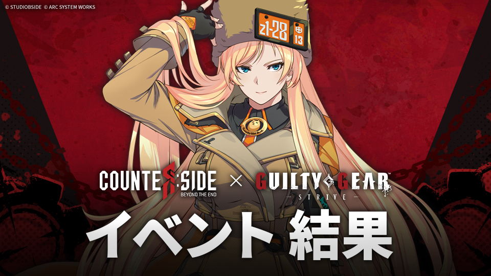日頃より『カウンターサイド』をご愛顧いただき、誠にありがとうございます。 『カウンターサイド』運営チームです。「CounterSide x GUILTY GEAR -STRIVE-コラボ記念!記念写真撮影イベント」へたくさんご応募いただき、誠にありがとうございました。下記にイベント結果をご案内いたしますので、ご確認お願いいたします。▣ 結果発表 当選された社長の皆様、おめでとうございます! これからも社長の皆様の期待に応え、より良いイベントを用意する予定ですので、たくさんのご参加をよろしくお願いいたします。「注意事項」※ イベント報酬は、2024.07.03 (水) 定期メンテナンスを通じて支給されます。※ イベント報酬は、結果発表後、7日以内にログインするとメールボックスから受け取れます。※ イベント報酬メールは、有効期限がありますので期間内にお受け取りください。※ その他のイベントに関するお問い合わせは、「カスタマーサポート」にご連絡ください。※ 本イベントに記載されていない事項については、当社の「イベントポリシー」に従います。