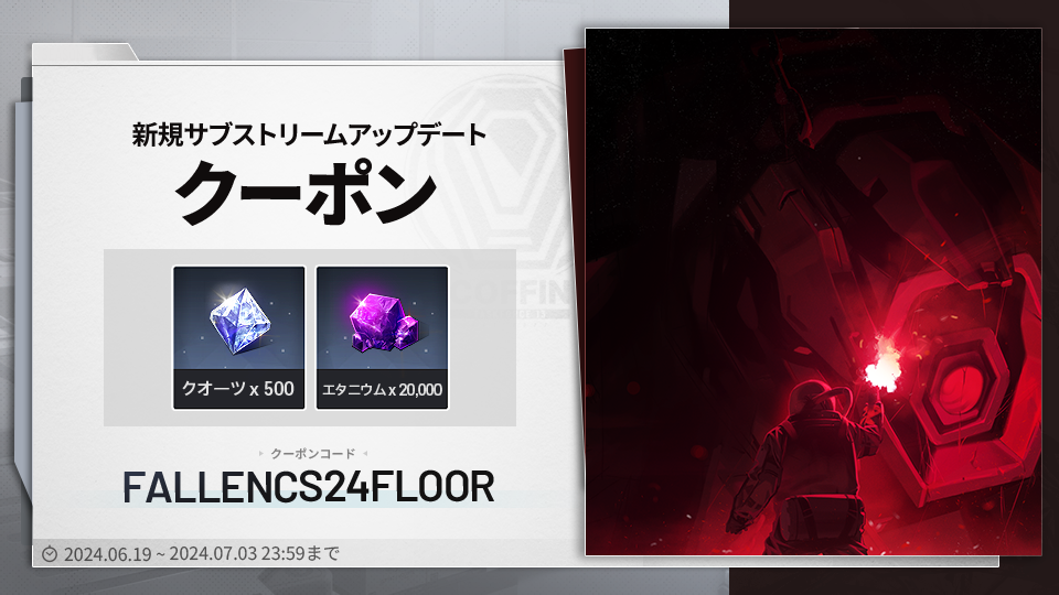 日頃より『カウンターサイド』をご愛顧いただき、誠にありがとうございます。 期間限定クーポンをご案内いたしますので、詳細は下記にてご確認ください。▼ クーポンコード:FALLENCS24FLOOR ▼獲得アイテム:▷ エタニウム x 20,000▷ クオーツ x 500▼ 有効期限:2024.07.03 23:59まで▼ クーポンの使い方▷ ゲーム設定>アカウント管理>クーポン入力※1アカウント1回のみ使用できます。今後とも「カウンターサイド」をよろしくお願いいたします。