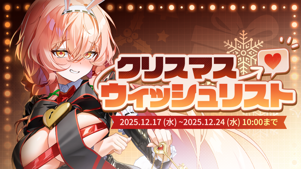 日頃より『カウンターサイド』をご愛顧いただき、誠にありがとうございます。 『カウンターサイド』運営チームです。きらめくイルミネーションが街を彩る、クリスマスシーズンが今年もやってきました!今年、社長の皆様にとって一番うれしいプレゼントは何でしょうか?サンタさんも、その答えを心待ちにしているようです。イベント期間中、今年ぜひ受け取りたいプレゼントを選ぶだけで、サンタさんが特別な祝福とともに社長の皆様のもとへやってきます。この機会をお見逃しなく!◈ 参加方法1. 下記の報酬の中で一番お気に入りの番号に投票してください。「イベント参加はこちら」◈ 報酬リスト報酬 1 - レリックバイナリー x 25報酬 2 - セットバイナリー x 50報酬 3 - チューニングバイナリー x 75報酬 4 - 特殊融合コア x 15報酬 5 - クオーツ x 500報酬 6 - 採用契約書 x 15報酬 7 - エタニウム x 12,250報酬 8 - 情報 x 12,250報酬 9 - クレジット x 1,225,000◈ 開催期間▷ 2025.12.17 (水) ~ 2025.12.24 (水) 10:00 ◈ 結果発表▷ 2025.12.24 (水)◈ 報酬の支給日付▷ 2025.12.25 (水)◈ 受け取り方法- 報酬の支給期間中にログインするとメールボックスへプレゼントが支給されます。「注意事項」- イベントへの参加および報酬の受け取りは、グローバルサーバーでのみ可能です。- 2026.01.01 (木) 23:59までログインするとメールボックスへプレゼントが支給されます。- イベント報酬メールは、有効期限がありますので期間内にお受け取りください。- イベント内容およびスケジュールは、当社の事情により変更、修正、またはキャンセルされる場合がございます。 変更となる場合は、イベントページを通じてご案内いたします。- 一番多くの票を獲得した番号の報酬が決定されます。- 決定された報酬はオンタイム報酬で支給されます。- イベント報酬は当社の事情により変更される場合がございます。- その他のイベントに関するお問い合わせは、「カスタマーサポート」にご連絡ください。- 本イベントに記載されていない事項については、当社の「イベントポリシー」に従います。
