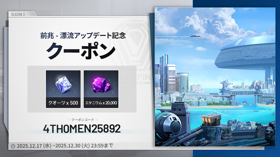 日頃より『カウンターサイド』をご愛顧いただき、誠にありがとうございます。 期間限定クーポンをご案内いたしますので、詳細は下記にてご確認ください。▼ クーポンコード:4TH0MEN25892▼獲得アイテム:▷ エタニウム x 20,000▷ クオーツ x 500▼ 有効期限:2025.12.30 23:59まで▼ クーポンの使い方▷ ゲーム設定>アカウント管理>クーポン入力※1アカウント1回のみ使用できます。今後とも「カウンターサイド」をよろしくお願いいたします。