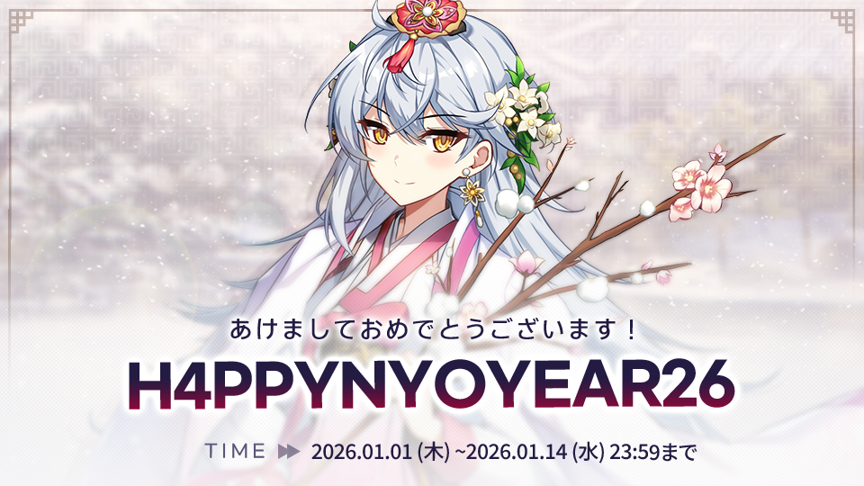 日頃より『カウンターサイド』をご愛顧いただき、誠にありがとうございます。オンタイム・ホットタイムイベントをご案内いたしますので、詳細は下記にてご確認ください。◆ オンタイムイベントの開催期間▷ 2026.01.01 (木) 00:00 ~ 2026.01.06 (火) 23:59◆ オンタイムイベントプレゼント▷ ガントレットポイント x 250▷ エタニウム x 5,000▷ 特殊融合コア x 1◆ オンタイムイベント内容▷ ログインすると、メールボックスにプレゼントが支給されます。(期間中毎日1回)◆ ホットタイムイベント内容1) 2025.12.31 (水) 00:00 ~ 2026.01.06 (火) 23:59▷ ガントレットポイント獲得量増加 +30%▷ ワールドマップ派遣任務の大成功率増加 +30%▷ 年俸交渉消費クレジット割引 +30%▷ すべての戦闘のエタニウム消費量減少 +30%[注意事項]– オンタイムイベントプレゼントは毎日1回のみ獲得できます。– オンタイムイベントのプレゼントは有効期限が過ぎると削除されますので、期間内にお受け取りください。– 適用中のホットタイム効果は、「ロビー」左上のホットタイムバフイメージをクリックすると確認することができます。------------------------------今回のオンタイム・ホットタイムイベントのご案内は以上となります。今後とも「カウンターサイド」をよろしくお願いいたします。