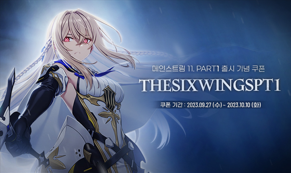 안녕하세요 사장님.메인스트림 [육익] PART 1이 업데이트되었습니다.사장님을 위한 쿠폰도 준비하였으니 꼭 유효기간 안에 사용해 주세요!▼ 쿠폰 코드▷ THESIXWINGSPT1▼ 쿠폰 보상▷ 20,000 이터니움▷ 500 쿼츠▼ 유효 기간▷ 2023.10.10(화) 23:59까지