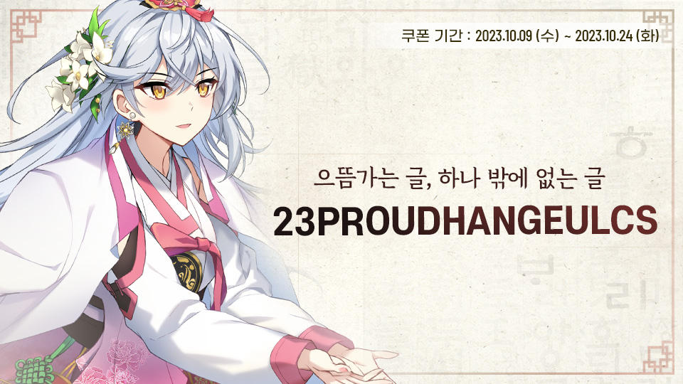안녕하세요 사장님.아름다운 우리의 글, 한글 창제 577돌을 맞이하였습니다!특별한 날 특별한 선물을 준비했으니 아래 쿠폰을 입력해 보세요!▼ 쿠폰 코드▷ 23PROUDHANGEULCS ▼ 쿠폰 보상▷ 500 쿼츠▼ 유효 기간▷ 2023.10.24(화) 23:59까지