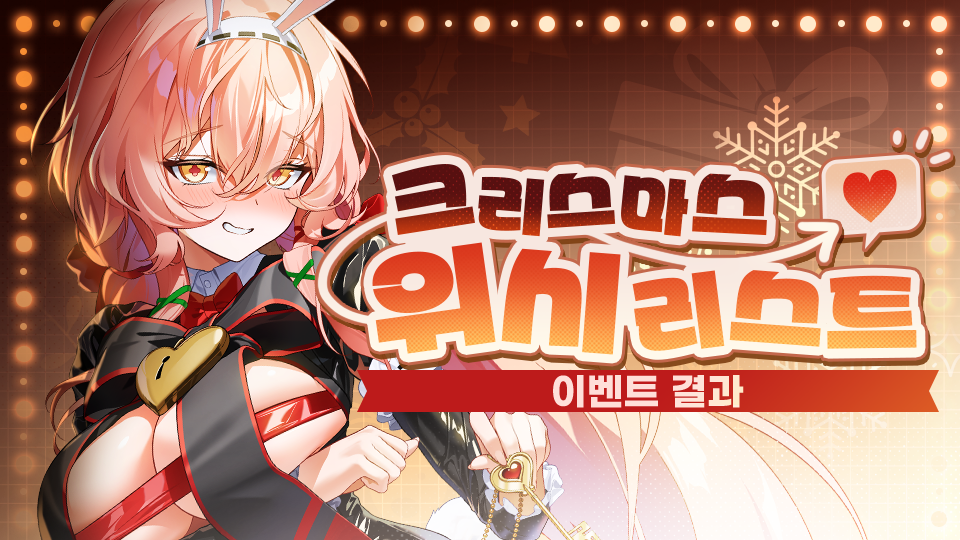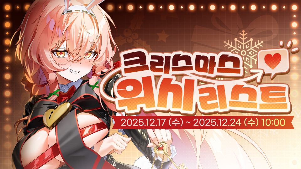 안녕하세요 사장님![2025 크리스마스 위시리스트 이벤트]에 참여해주신 사장님들께 감사드립니다.사장님들께서 선택하신 이벤트 보상은 무엇일지 무척 궁금하실 텐데요.2025 크리스마스 위시리스트 이벤트 결과는 아래를 참고해 주세요!◈ 이벤트 보상- 렐릭 바이너리 25개◈ 보상 지급 기간▷ 2025.12.25(목) 00:00 ~ 2026.1.1(목) 23:59◈ 보상 수령 방법- 보상 지급 기간 내 접속 시 우편함으로 이벤트 선물이 지급됩니다.* 이벤트 보상이 포함된 우편 수신 일시로부터 7일의 유효기간이 발생합니다.[유의사항]※ 이벤트 보상은 2025.12.25(목) 00:00 부터 수령하실 수 있습니다.※ 이벤트 보상은 2026.1.1 (목) 23:59까지 접속하시면 우편함으로 받으실 수 있습니다.※ 이벤트 보상 우편은 7일의 유효기간이 존재합니다.※ 기타 이벤트 관련 문의 사항은 고객센터를 통해 전달해 주시기 바랍니다.※ 본 이벤트에 명시되지 않은 사항에 대해서는 [카운터사이드 이벤트 정책]에 따릅니다.앞으로 더욱 즐겁고 풍성한 이벤트로 찾아올 수 있도록 노력하겠습니다.감사합니다.