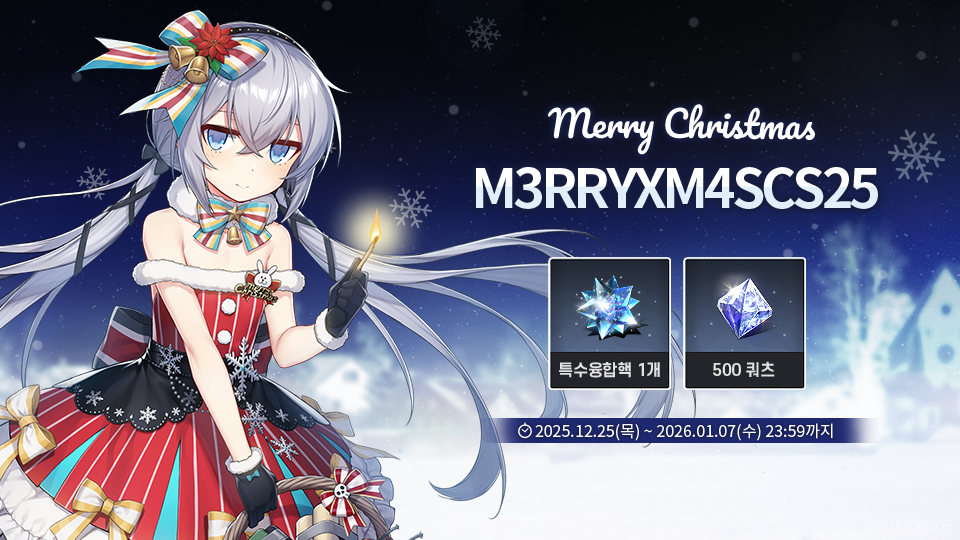 사장님들 모두 메리 크리스마스!크리스마스를 맞이하여 특별한 선물을 준비했어요!꼭 유효기간 안에 사용해 주세요!▼ 쿠폰 코드▷ M3RRYXM4SCS25▼ 쿠폰 보상▷ 500 쿼츠▷ 특수융합핵 1개▼ 유효 기간▷ 2026.1.7(수) 23:59까지